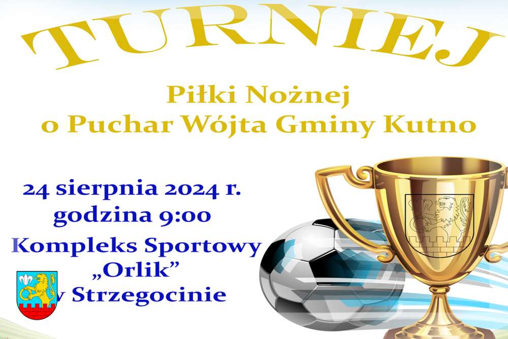 Zapraszamy do udziału w Turnieju Piłki Nożnej o Puchar Wójta Gminy Kutno organizowanym w dniu 24 sierpnia 2024 roku na boisku sportowym „Orlik" w Strzegocinie.