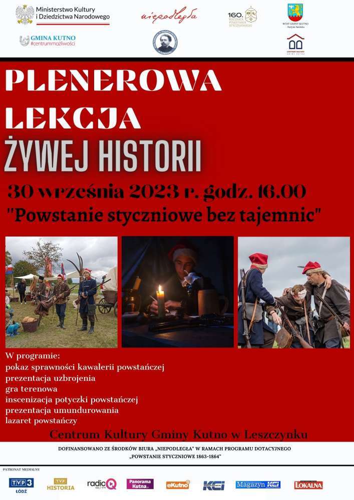 Już 30 września 2023 r. o godzinie 16:00 zapraszamy do zespołu dworsko parkowego w Leszczynku na Plenerową lekcję żywej historii ,,Powstanie styczniowe bez tajemnic" organizowaną przez Gminę Kutno i Centrum Kultury Gminy Kutno. Podczas wydarzenia wraz z grupą Walfalla - Inscenizacje Historyczne będziecie mogli Państwo przenieść się wprost do burzliwego okresu powstania styczniowego, przeżyć fascynującą podróż przez historię Polski i spotkanie z żywymi postaciami z tamtych czasów. To niepowtarzalna okazja, aby lepiej zrozumieć narodową tożsamość i przypomnieć sobie o naszych bohaterskich przodkach. Będzie to nie tylko okazja do nauki, ale również do refleksji nad wartościami, które kształtują naszą historię i naród.