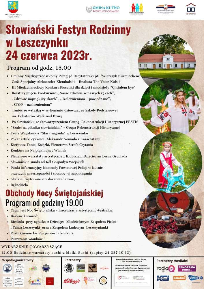 Już 24 czerwca 2023 roku zapraszamy do Centrum Kultury Gminy Kutno w Leszczynku na Słowiański Festyn Rodzinny. Wydarzenie organizowane jest przez Gminę Kutno we współpracy z Centrum Kultury Gminy Kutno, Gminną Biblioteką Publiczną im. Józefa Bohdana Zaleskiego, Gminnym Ośrodkiem Pomocy Społecznej, Komendą Powiatowa Policji w Kutnie, szkołami podstawowymi i Kołami Gospodyń Wiejskich z terenu gminy Kutno. Patronat honorowy nad festynem objęła Wójt Gminy Kutno Justyna Jasińska.
