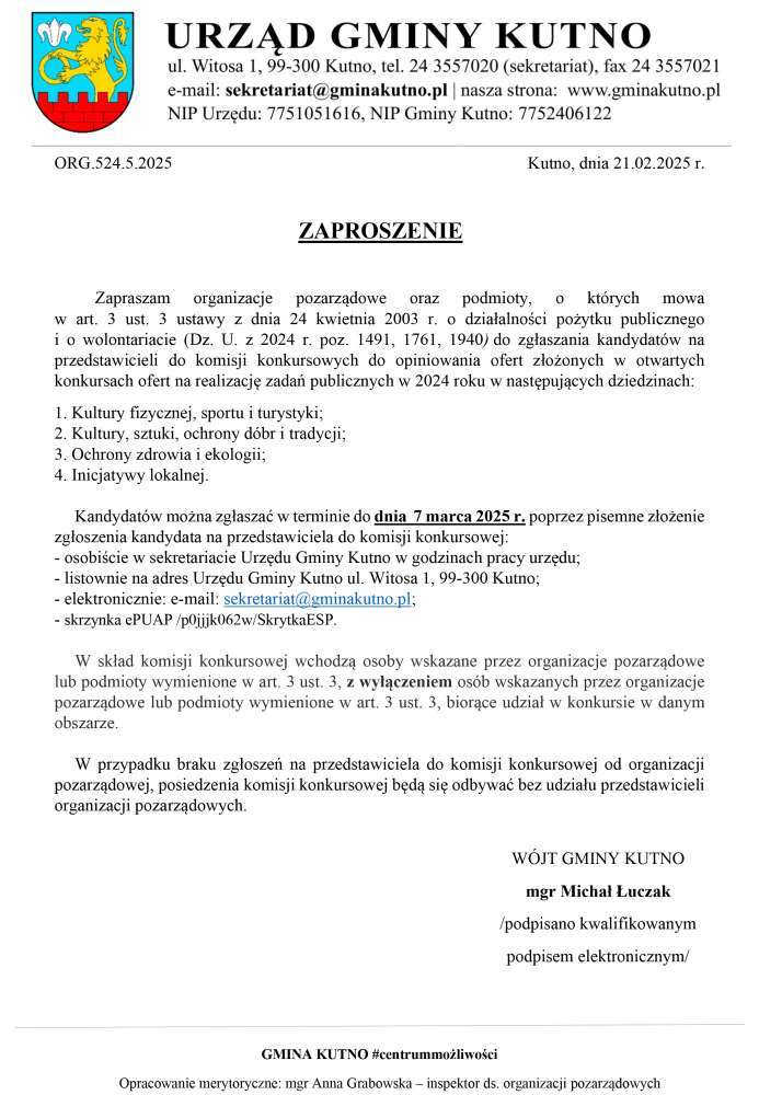 Wójt Gminy Kutno Michał Łuczak zaprasza przedstawicieli organizacji pozarządowych do komisji konkursowej oceniającej oferty złożone w otwartych konkursach na realizację zadań publicznych.