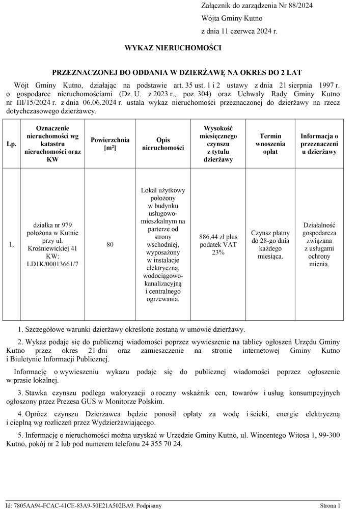 Poniżej treść zarządzenia wójta gminy Kutno w sprawie przeznaczenia do oddania w dzierżawę i ogłoszenia wykazu nieruchomości stanowiących własność Gminy Kutno i ustalenia wysokości stawki czynszu dzierżawnego.