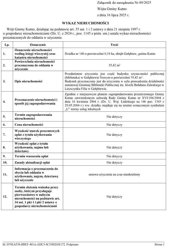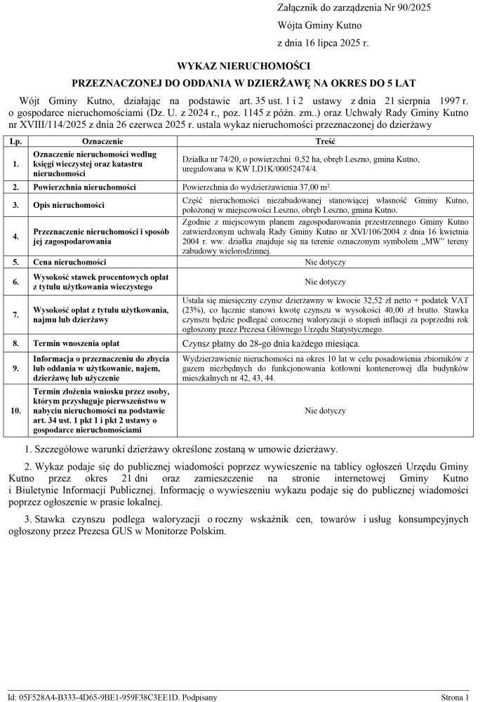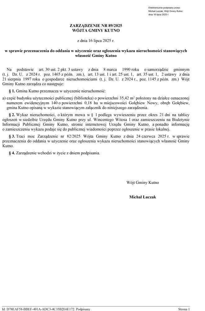 Poniżej treść zarządzeń Wójta Gminy Kutno w sprawie przeznaczenia do oddania w użyczenie oraz ogłoszenia wykazu nieruchomości stanowiących własność Gminy Kutno.