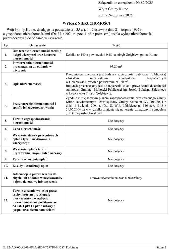 Poniżej treść zarządzenia Wójta Gminy Kutno w sprawie przeznaczenia do oddania w użyczenie oraz ogłoszenia wykazu nieruchomości stanowiących własność Gminy Kutno