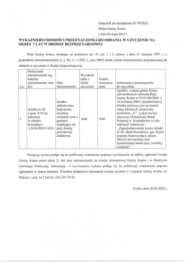 Poniżej treść zarządzenie Wójta Gminy Kutno z dnia 26.05.2022r. w sprawie przeznaczenia do oddania w użyczenie oraz ogłoszenia wykazu nieruchomości stanowiącej własność Gminy Kutno