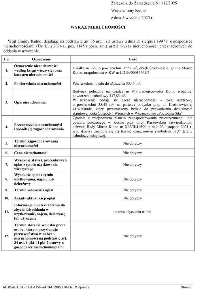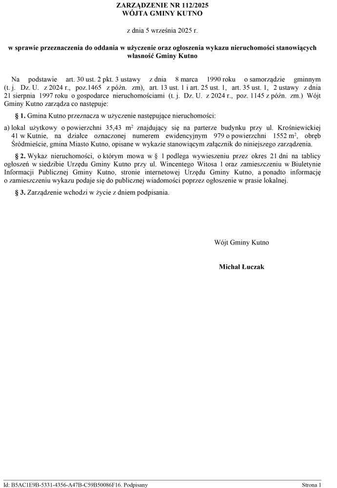 Poniżej treść Zarządzenia NR 112/2025 WÓJTA GMINY KUTNO z dnia 5 września 2025 r.w sprawie przeznaczenia do oddania w użyczenie oraz ogłoszenia wykazu nieruchomości stanowiących własność Gminy Kutno.
