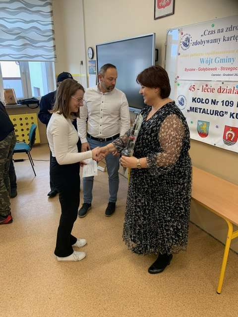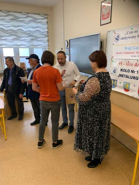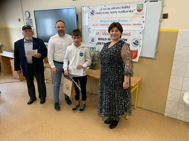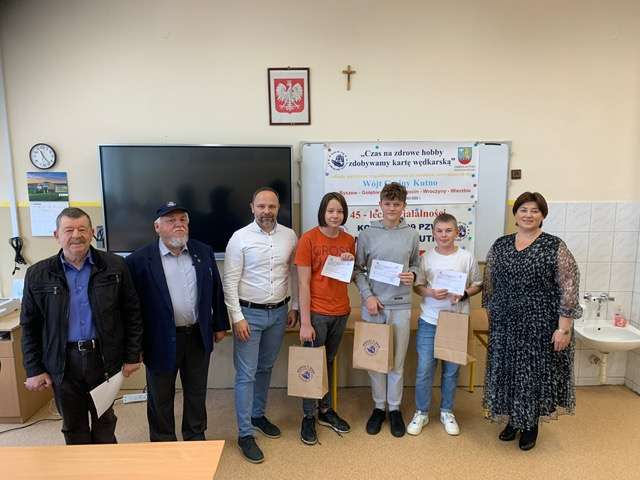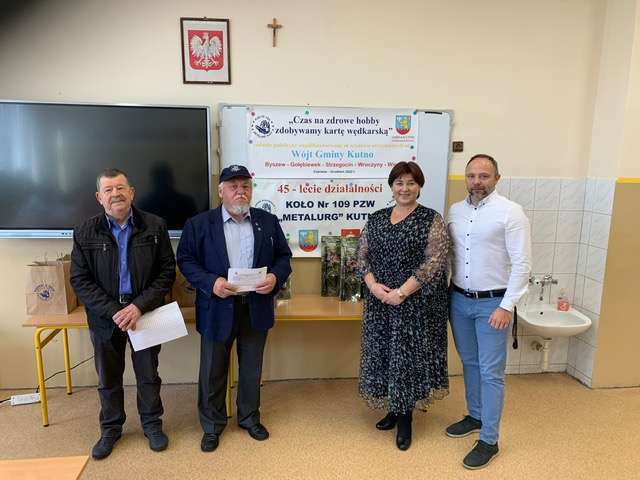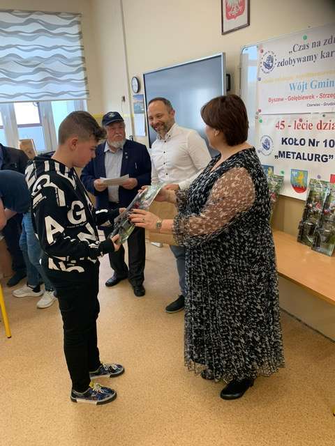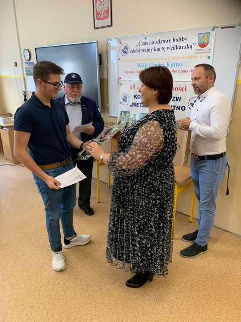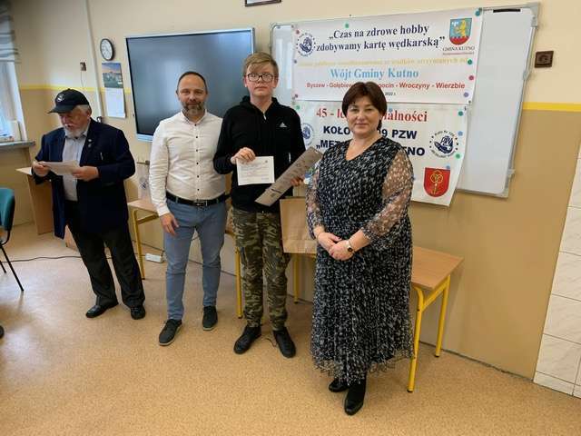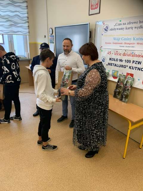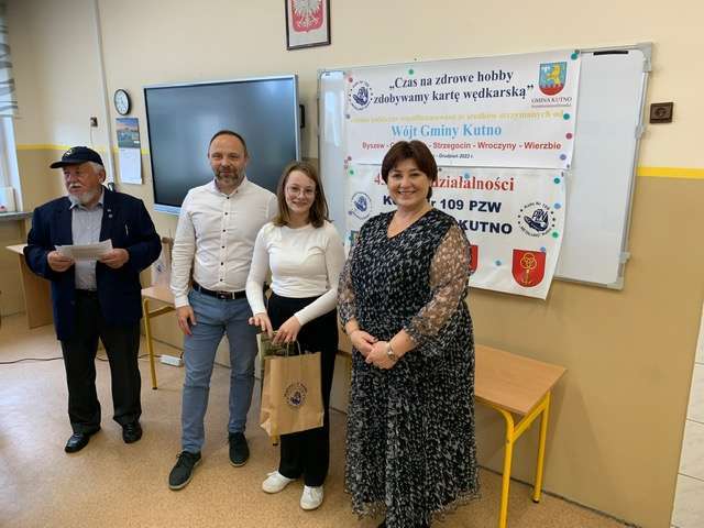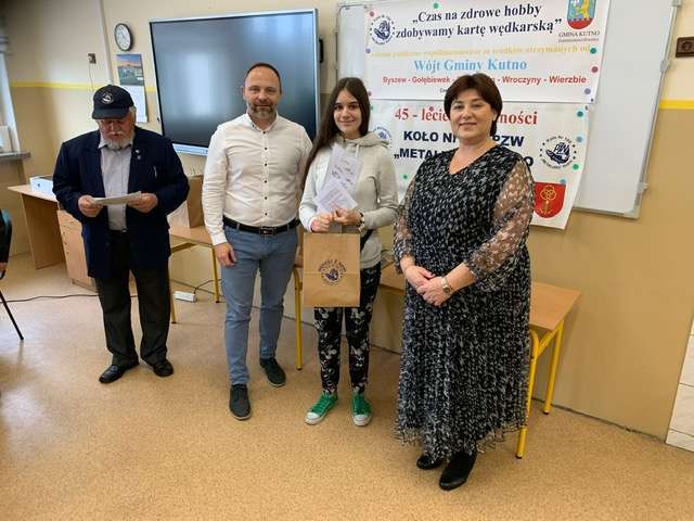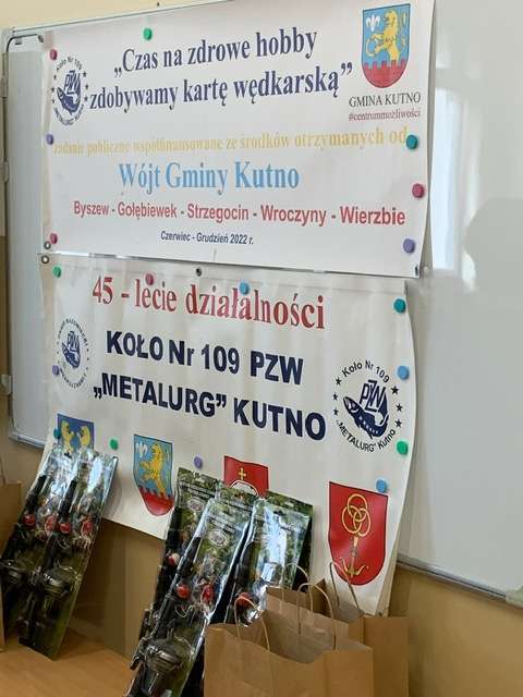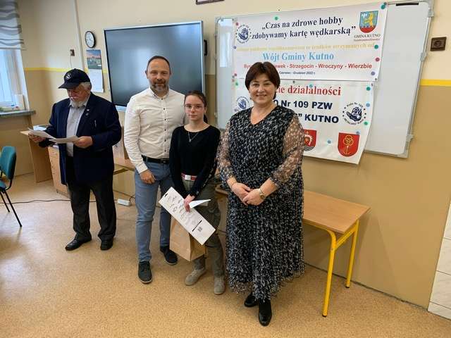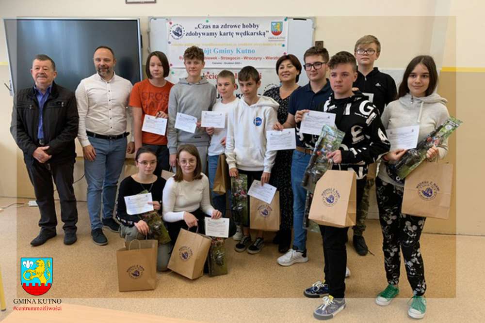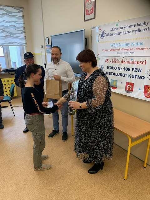 W dniu 09.11.2022 r. w Szkole Podstawowej im. Wł. St. Reymonta w Gołębiewku Wójt Gminy Kutno Justyna Jasińska wraz członkami Zarządu Koła nr 109 OM PZW „METALURG" w Kutnie - Prezesem Koła Zbigniewem Gralewskim i członkiem Zarządu Aleksandrem Rzeźnikiem oraz Dyrektorem szkoły Przemysławem Kubickim wręczyła zaświadczenia o pozytywnym zaliczeniu egzaminu na kartę wędkarską w ramach programu „CZAS NA ZDROWE HOBBY – ZDOBYWAMY KARTĘ WĘDKARSKĄ". Uroczystości towarzyszyło wręczenie drobnych upominków w tym sprzętu wędkarskiego 10 uczniom z klas VII- VIII.