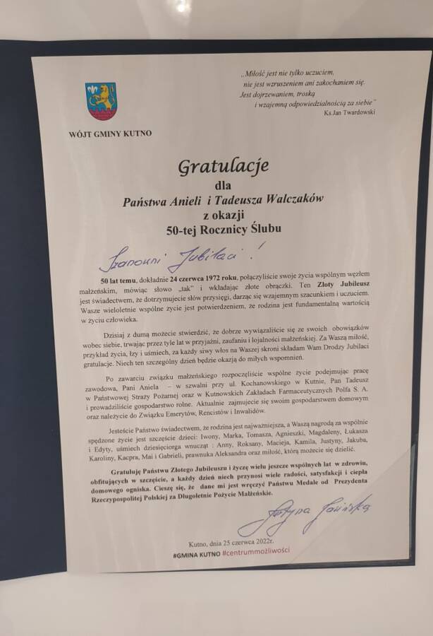 W dniu 25 czerwca 2022 roku w Urzędzie Stanu Cywilnego w Kutnie odbyła się wyjątkowa uroczystość. Pięćdziesięciolecie pożycia małżeńskiego, czyli Złote Gody, obchodzili państwo Aniela i Tadeusz Walczakowie. Życzenia i medale jubilatom wręczyła Wójt Gminy Kutno Justyna Jasińska.