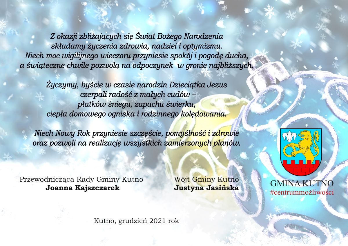 Z okazji nadchodzących Świąt Bożego Narodzenia przyjmijcie Państwo życzenia od Wójt Gminy Kutno Justyny Jasińskiej i Przewodniczącej Rady Gminy Kutno Joanny Kajszczarek
