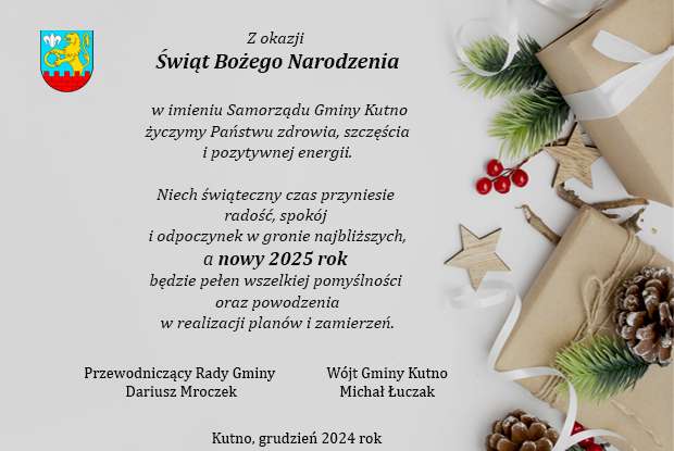 Z okazji nadchodzących Świąt Bożego Narodzenia przyjmijcie Państwo życzenia od Wójta Gminy Kutno  Michała Łuczaka i Przewodniczącego Rady Gminy Kutno Dariusza Mroczka.
