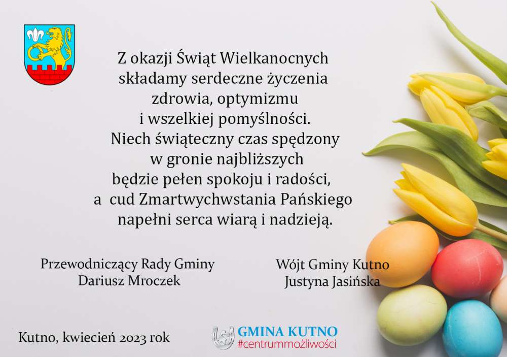 Wójt Gminy Kutno Justyna Jasińska i Przewodniczący Rady Gminy Kutno Dariusz Mroczek składają życzenia świąteczne. Wesołego Alleluja!