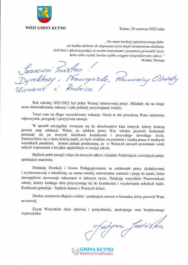 Z okazji zakończenia roku szkolnego 2021/2022 Wójt Gminy Kutno Justyna Jasińska przekazała podziękowania i życzenia dla Uczniów, Rodziców oraz Dyrektorów, Nauczycieli i pozostałych Pracowników Szkół z terenu Gminy Kutno.